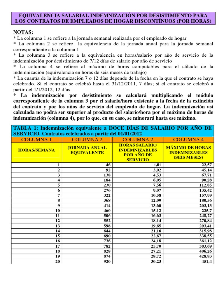 TABLA SALARIAL DE INDEMNIZACIONES POR DESPIDO EMPLEADAS/OS DE HOGAR