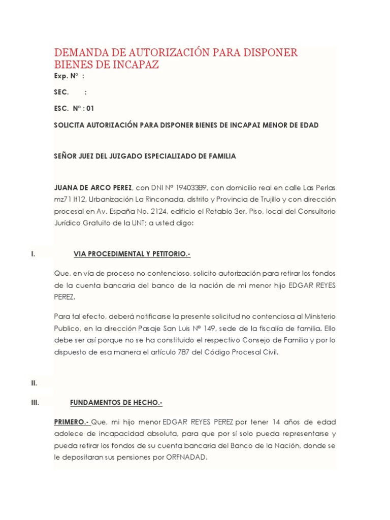 Demanda de Autorización Para Disponer Bienes de Incapaz Demanda judicial Ley procesal