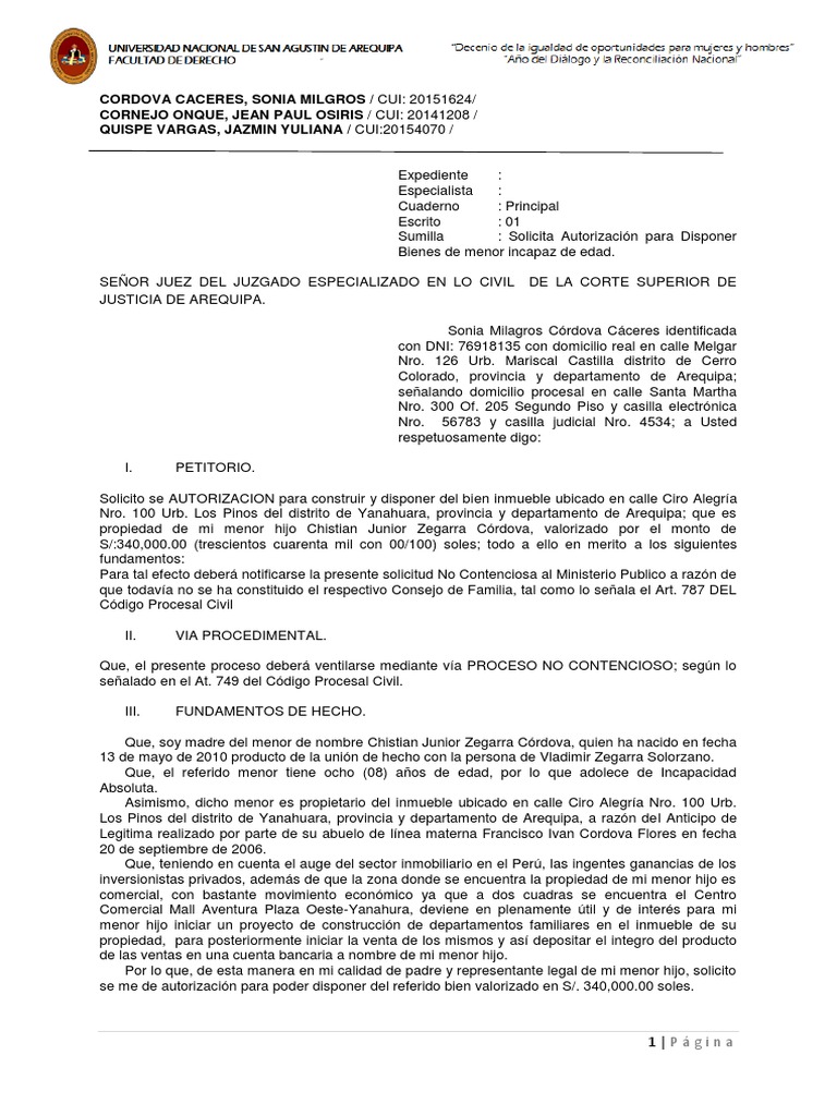 (DOC) SOLICITA AUTORIZACION PARA DISPONER BIENES DE INCAPAZ MENOR DE EDAD MILAGROS