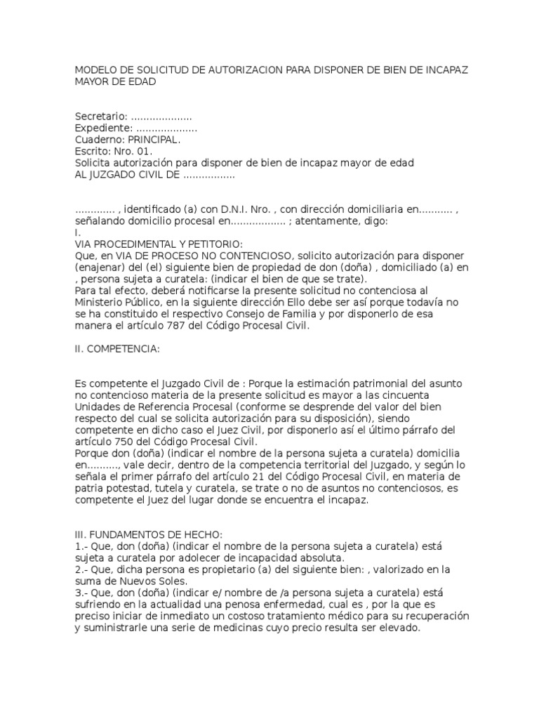 Modelo de Solicitud de Autorizacion para Disponer de Bien de Incapaz Mayor de Edad PDF
