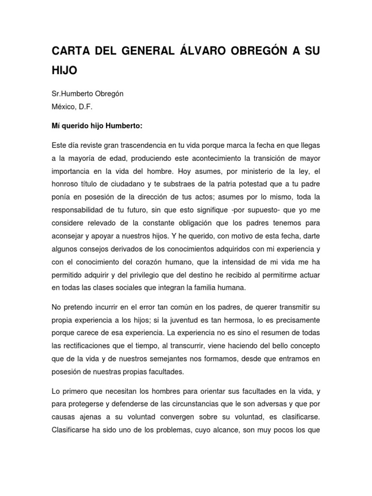 Carta Del General Álvaro Obregón A Su Hijo PDF Science Ciencia filosófica