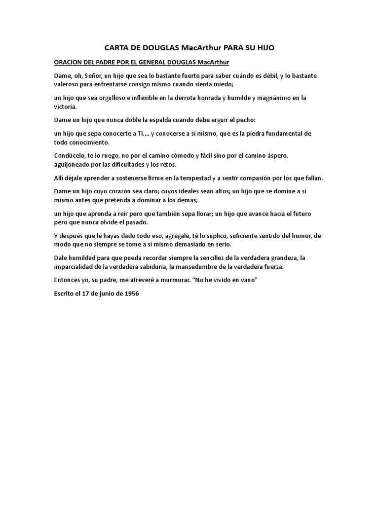 Redondo y Cuadrado: CARTA DE DOUGLAS MacARTHUR PARA SU HIJO. Redondo y Cuadrado: CARTA DE DOUGLAS MacARTHUR PARA SU HIJO: ORACION DEL PADRE POR EL GENERAL DOUGLAS MacARTHUR Dame, oh Señor, un hijo que sea lo bastante fuerte para saber cuándo es débil, y lo bas. Publicado por creemos en el nombre de Dios empezamos la tarde el dia y noche en.