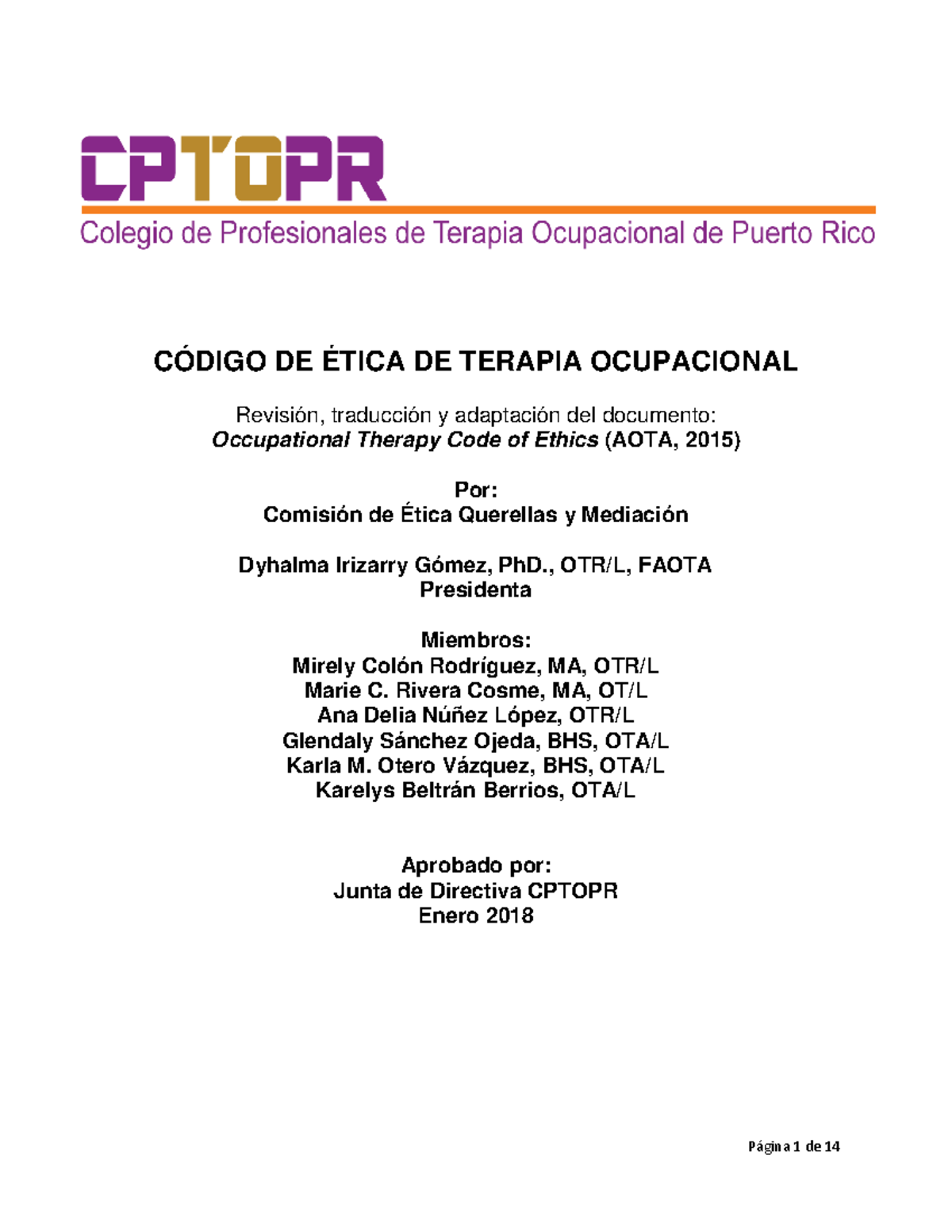Código de Ética AOTA CÓDIGO DE ÉTICA DE TERAPIA OCUPACIONAL Revisión, traducción y