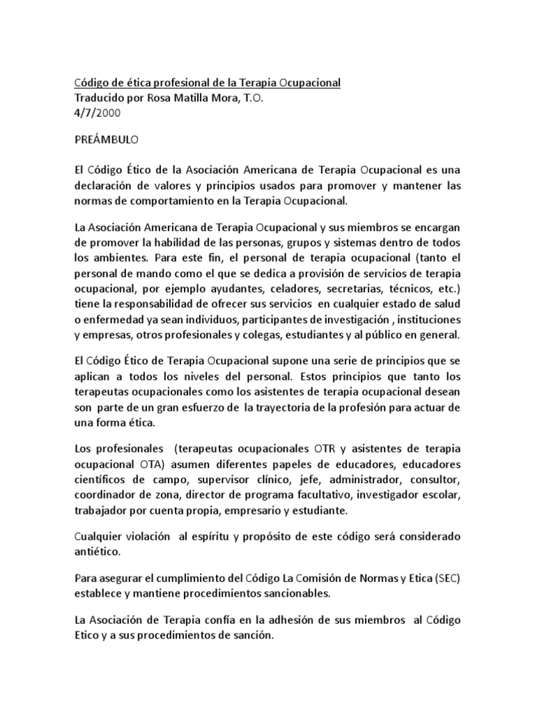 CÓDIGO ÉTICO DE TERAPIA OCUPACIONAL Traducido por Rosa Matilla Mora , T. 4/7/ PREÁMBULO. El Código Etico de la Asociación Americana de Terapia Ocupacional es una declaración de valores y principios usados para promover y mantener las normas de comportamiento en la Terapia Ocupacional.
