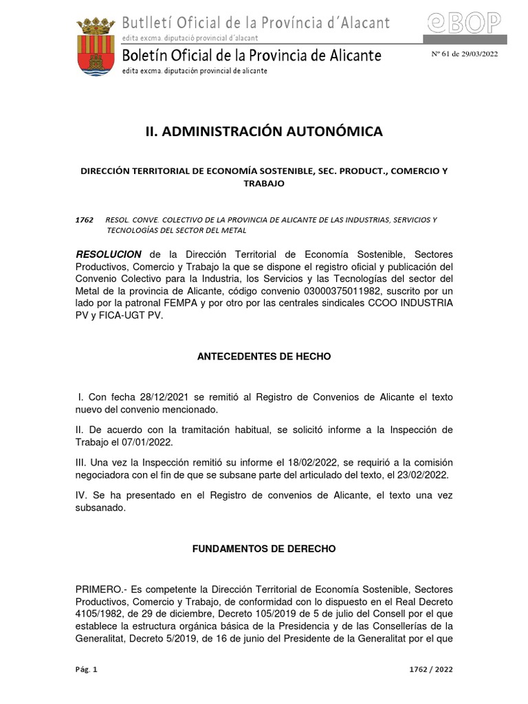 Convenio Colectivo para la Industria, los Servicios y las Tecnologías del sector del Metal de la provincia de Alicante, código convenio 03000375011982, suscrito por un lado por la patronal FEMPA y por otro por las centrales sindicales CCOO INDUSTRIA PV y FICA-UGT PV. ANTECEDENTES DE HECHO I. Con fecha 28/12/2021 se remitió al Registro de.