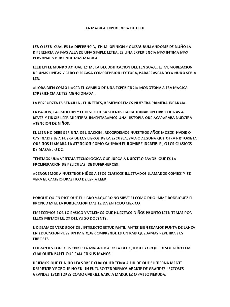 Sinopsis de LA EXPERIENCIA DE LEER. Desde su publicación en 1961 este pequeño estudio sobre La experiencia de leer no ha dejado de ser reeditado al punto de convertirse en un clásico. En el propone C. S. Lewis un "experimento" que procede al reves de lo que es habitual en la crítica literaria: "juzgar la literatura por cómo las personas la.