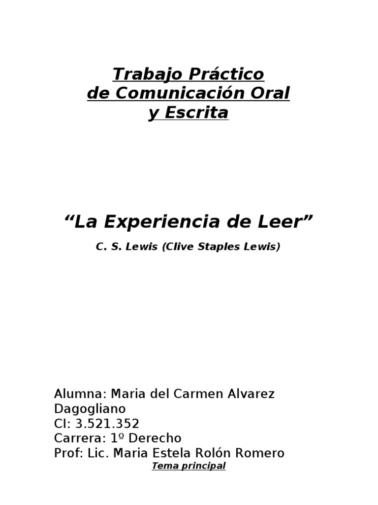 La Experiencia De Leer, CS Lewis by C.S. Lewis. Publication date 2006 Usage Public Domain Mark 1.0 Topics Filosofía Collection opensource Language. PDF download. download 1 file . SINGLE PAGE PROCESSED JP2 ZIP download. download 1 file.