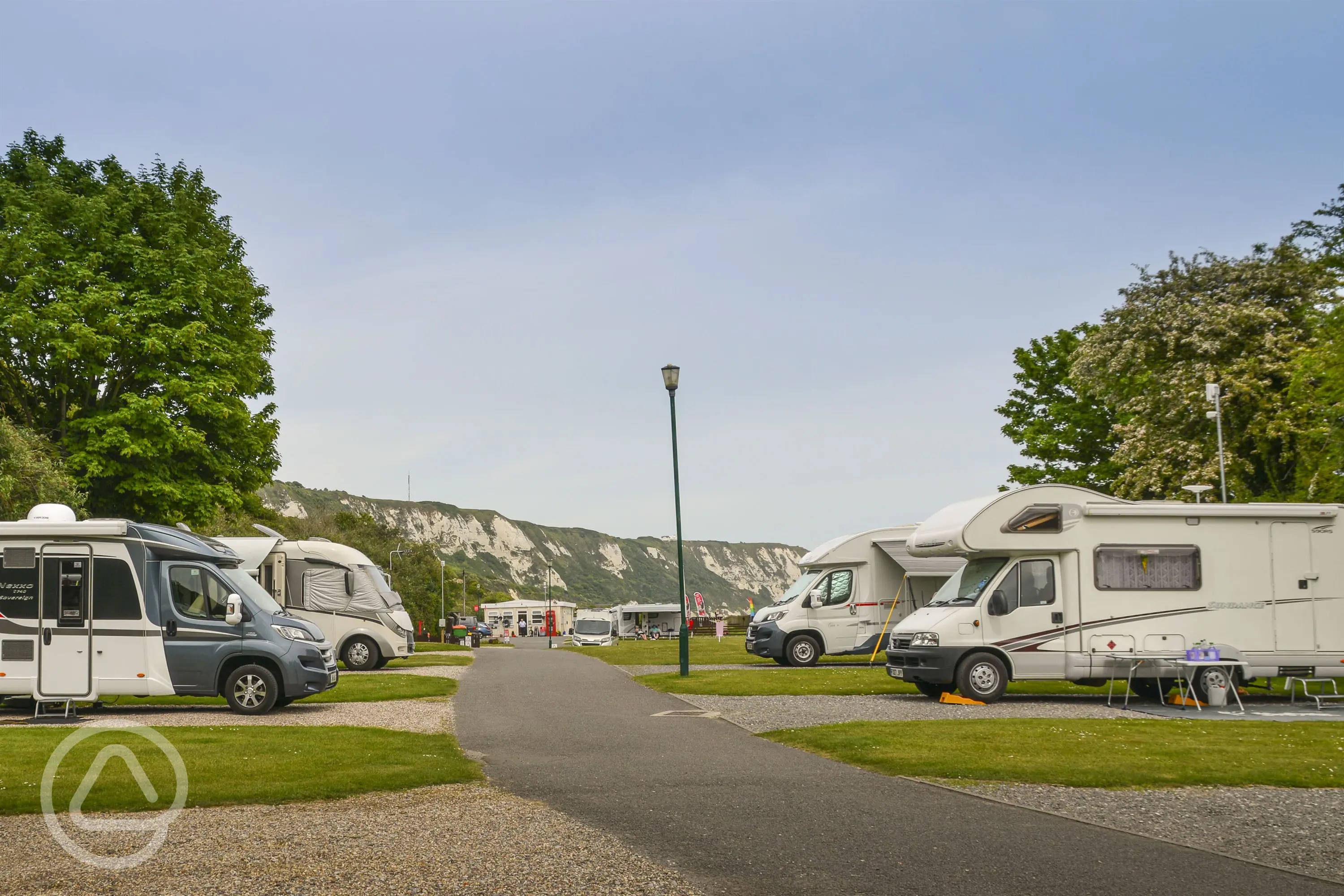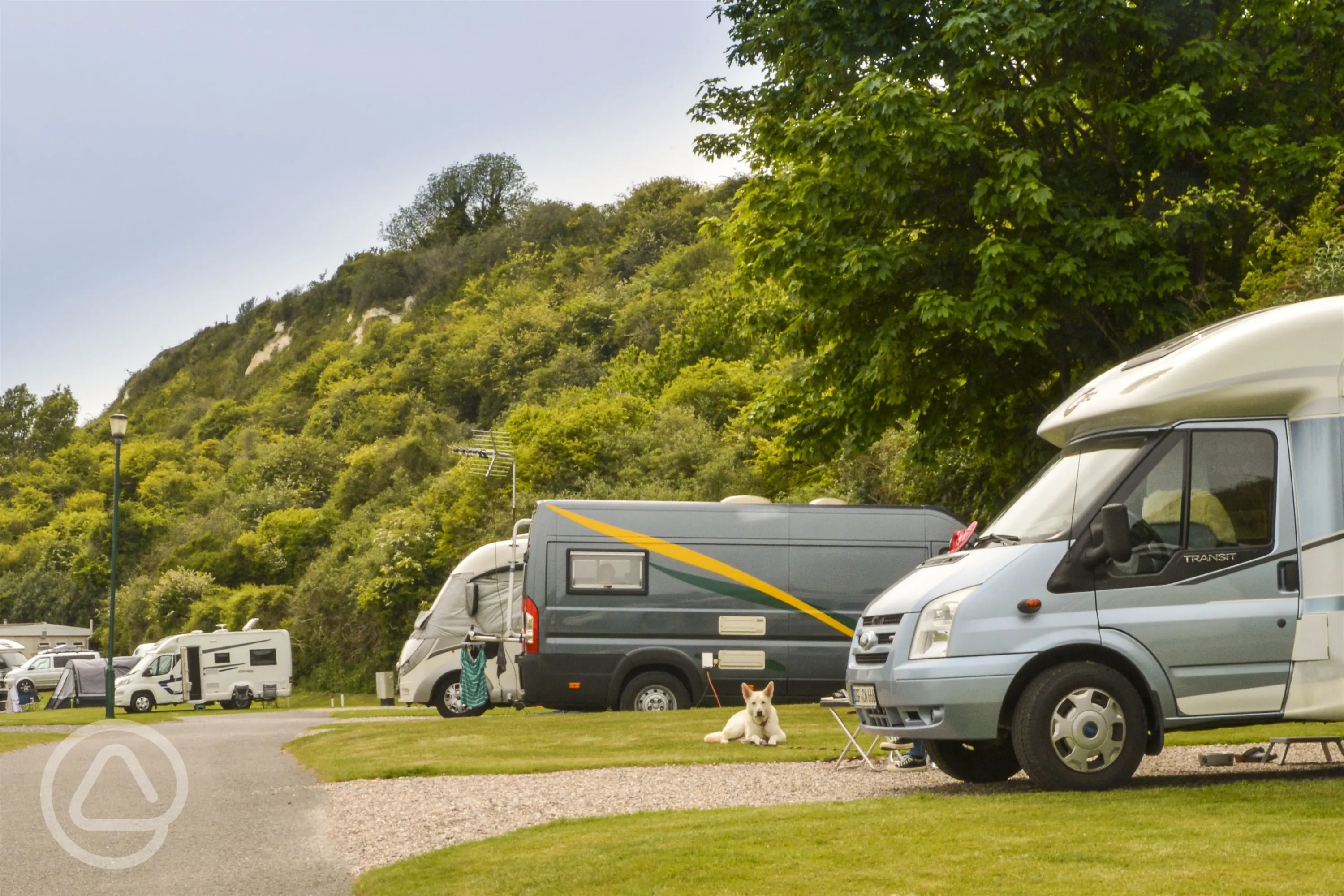 Folkestone Camping & Caravanning Club site is ideally located whether you are holidaying in Kent or taking a day trip to France by Channel Tunnel. The site enjoys a dramatic cliff-top position with views of the sea and the Dover-Folkestone coast's chalky cliffs. Walkers and dog owners will enjoy the walks from the site along the cliffs and beach.