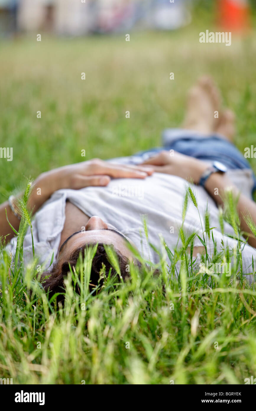 Hombre tumbado sobre el césped shot de bajo nivel. Muy poca profundidad de campo Fotografía de