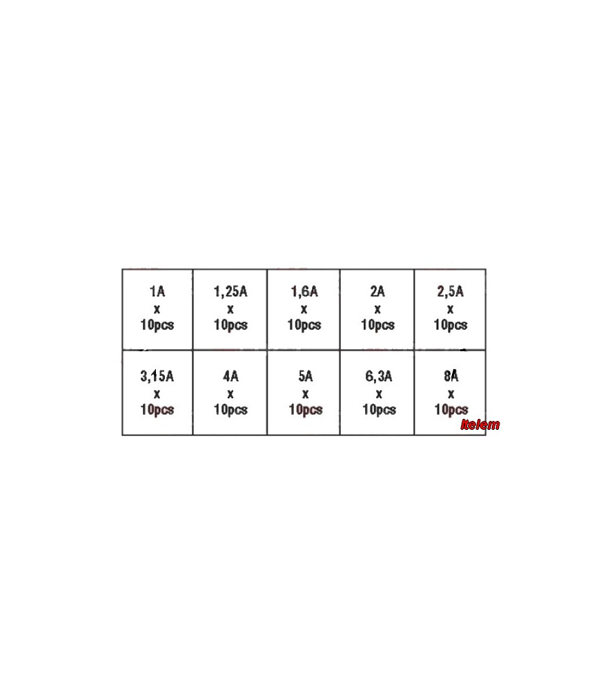 Code ErreBi: 12599 Prix au 9 pièces Remarque: Quantité 1 correspond à 9 pièces Exemple: Si vous achetez 3 quantités, vous recevrez 27 pièces Size: 5x20 Feature: F = fast Rated current: 4 A Voltage: 250V Body material: glass Breaking capacity: 40A L Voltage drop: 130 mV I2T: 22 Resistance: 0.021 ohms Capsules Material: nickel-plated brass Scheda Tecnica Ampérage: 4A Matériel.