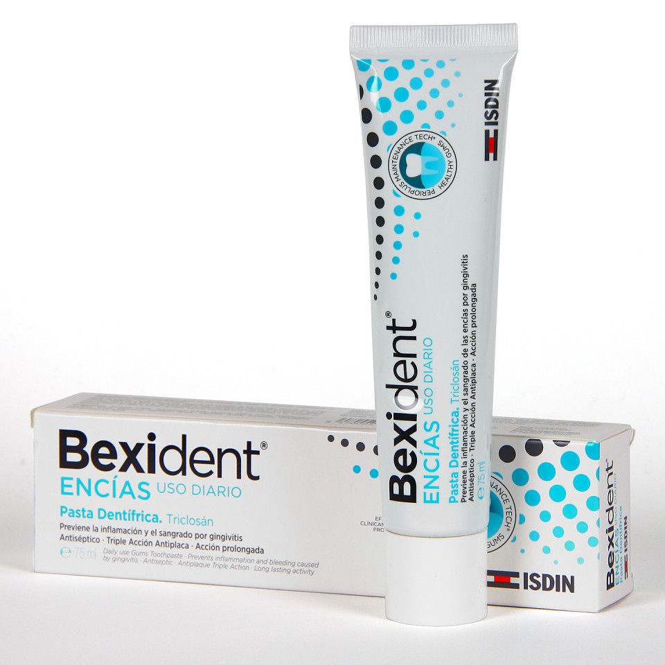BEXIDENT ENCIAS PASTA DENTAL 75 ML. 6,07 € 6,90€. IVA Incluido. Cantidad. Añadir al carrito. Bexident Encías es una pasta dentífrica formulada con triclosán encargada de cuidar la salud e higiene de nuestros dientes de forma diaria y prevenir la aparición de posibles enfermedades o problemas de salud bucodental. Referencia: 363838.