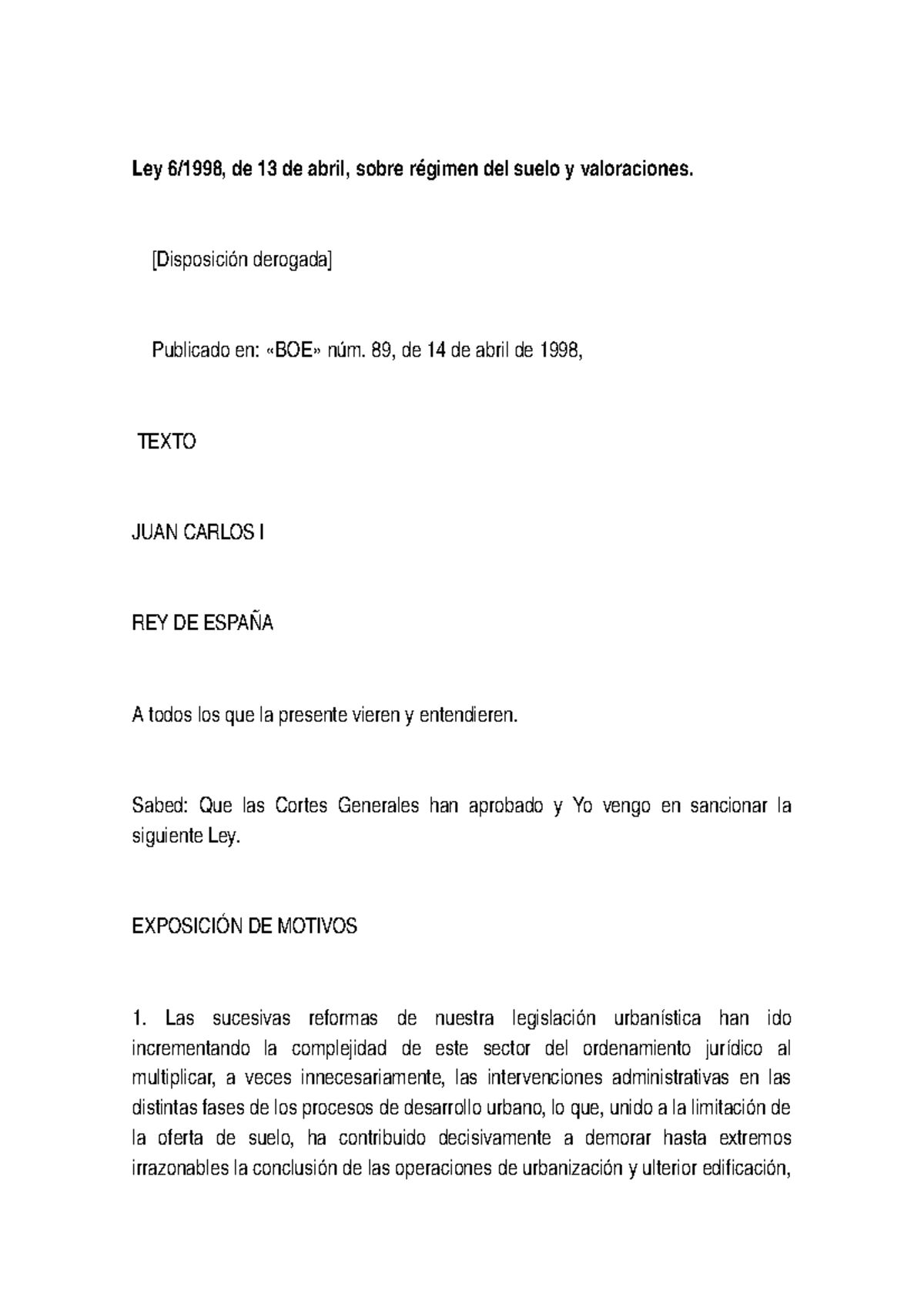 Apuntes, temas Ley del suelo 1998 exp. motivo Ley 6/1998, de 13 de