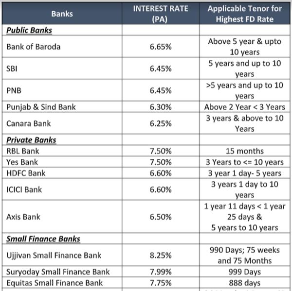 SBI senior citizen FD latest rates. State Bank of India (SBI), the country's largest lender, offers an interest rate between 4% to 7.50% for tenure ranging from 7 days to 10 years. On a 5-year.