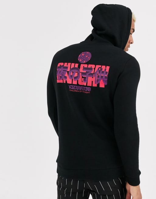 Sudadera larga con capucha en negro con estampado en la parte posterior