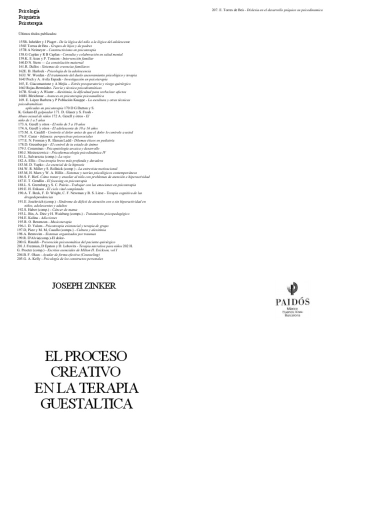 Download Free PDF. Zinker Joseph El Proceso Creativo En La Terapia Gestaltica.. Zinker Joseph El Proceso Creativo En La Terapia Gestaltica. Grupo B Matutino. Libro. See Full PDF.